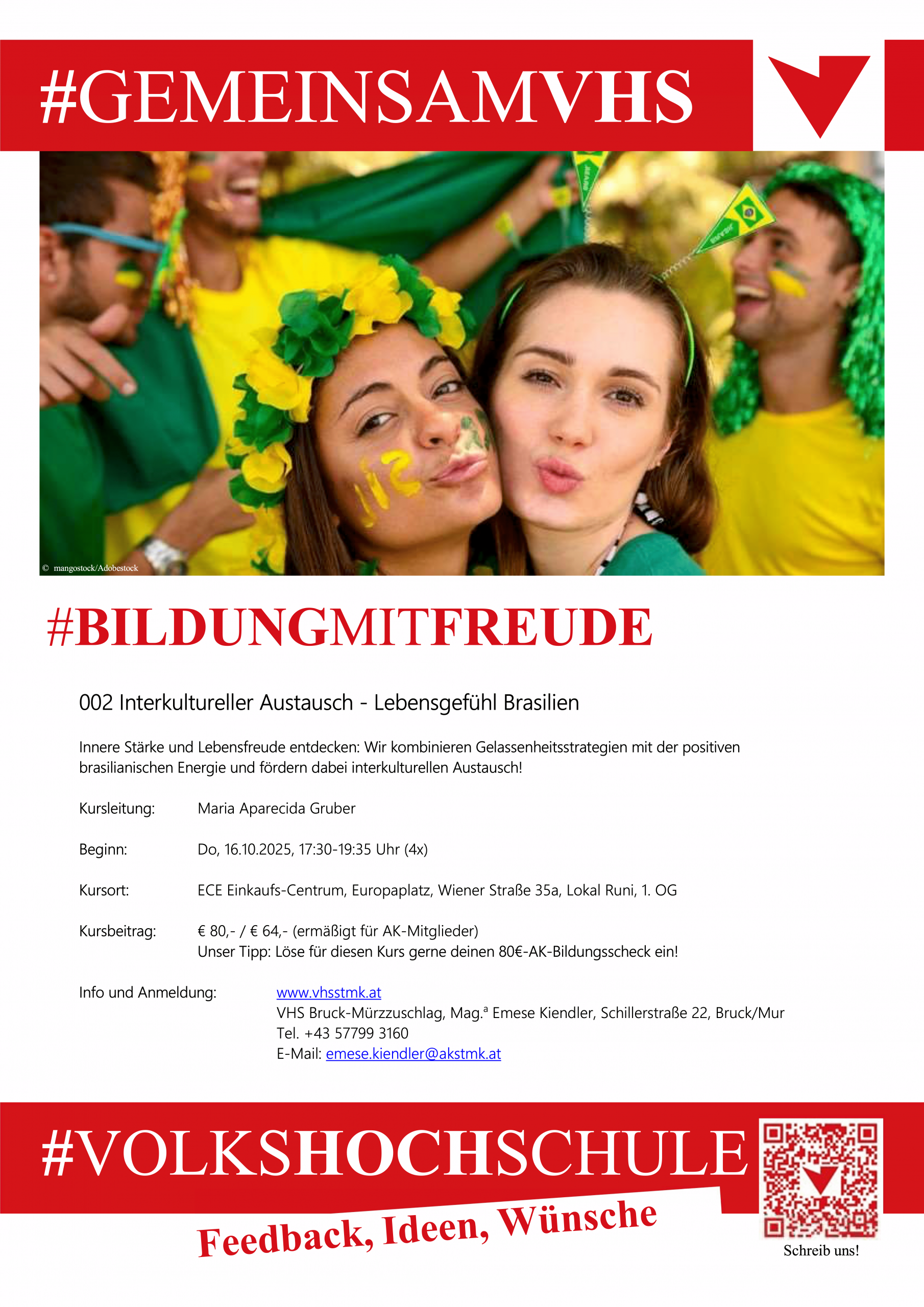 Seit Do 16.10. findet von 17:30 – 19:35 an insgesamt 4 Donnerstagen der Interkulturelle Austausch – Lebensgefühl Brasilien unter der Leitung von Maria Aparecida Gruber statt.