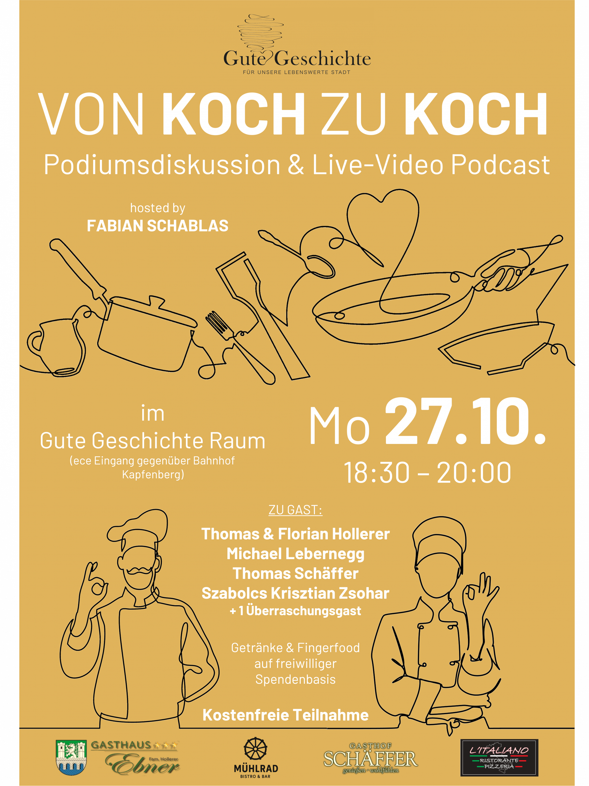 Am Mo 27.10. von 18:30 – ca. 20:00 haben wir ein weiteres spannendes Angebot für euch. In Kooperation mit Fabian Schablas wird es einen spannenden Live Video-Podcast vor Publikum über Kulinarik, Inspiration und der Leidenschaft zum Kochen geben.