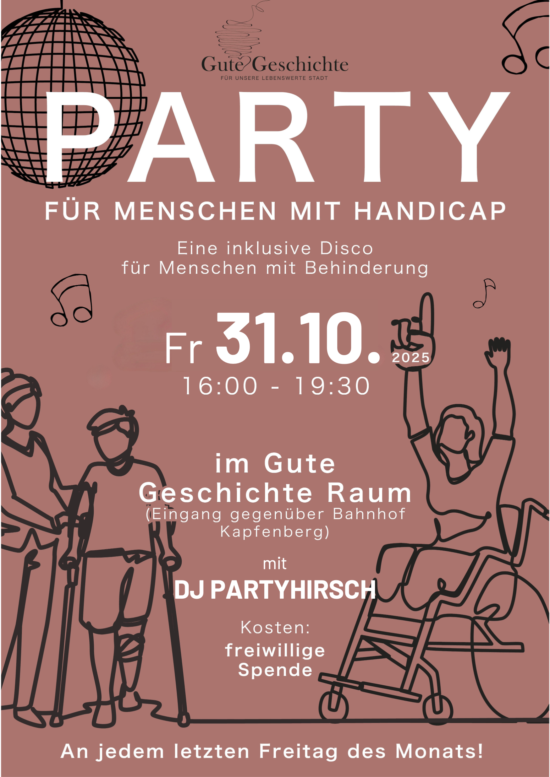 Wir freuen uns die legendäre Party für Menschen mit Handicap weiterzuführen. In Kooperation mit Roman Steinwender gibt es jeden letzten Freitag des Monats im Gute Geschichte Raum diese besondere Party.