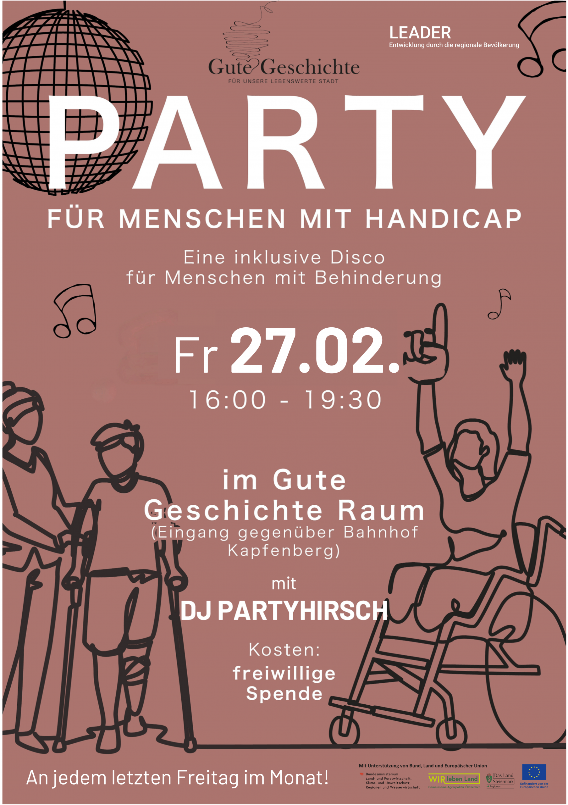 Wir freuen uns auch im neuen Jahr unsere legendäre Party für Menschen mit Handicap weiterzuführen. In Kooperation mit Roman Steinwender und Peter Köstenberger wird sie wieder an jedem letzten Freitag des Monats im Gute Geschichte Raum stattfinden.