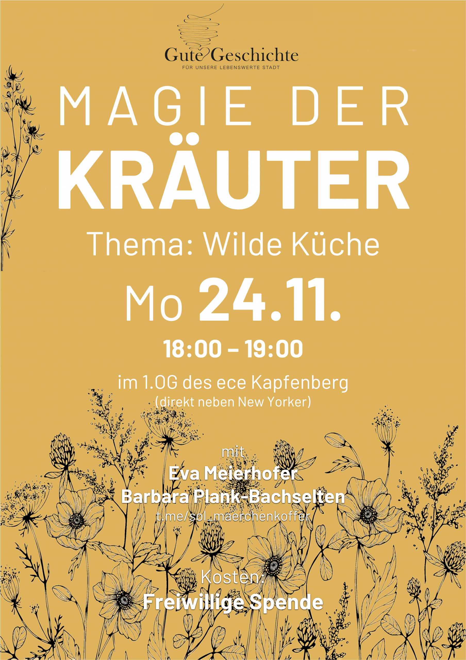 Mo24Nov18:0019:00Vortrag: Magie der Kräuter - Wilde Küche18:00 - 19:00 im 1.OG des ece Kapfenberg (direkt neben New Yorker)
